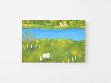 湖のそばの草原で遊ぶ、ひつじの親子の風景をスポンジタッチで描いた水彩画の