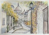 秋のパリ、モンマルトルです。日が短くなる秋の風景です。水彩紙に透明水彩絵の具で描かれています。