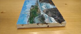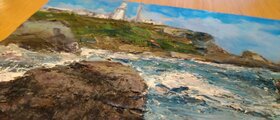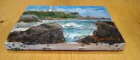 灯台のどっしりとした佇まいと岩に弾ける波。小さな絵ですが波の動きを感じていただければ幸いです。