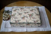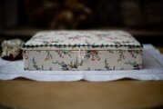 バラ柄のヴィンテージ布を使って制作しました。内側の薄黄色の布は現代ものです。