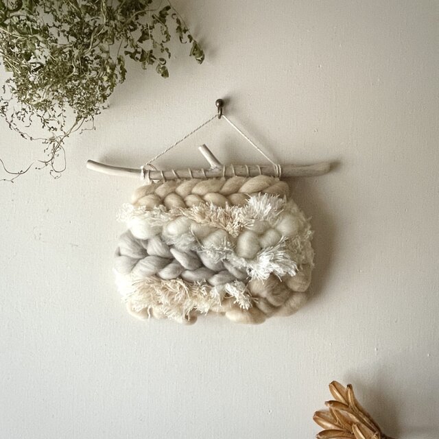 ミルクホワイトにベージュ、ナチュラルグレーなどの柔らかなお色の羊毛やコットン、ファンシーヤーンなどの素材を組み合わせ落ち着いたお色のみでまとめていますので、スワッグ等の他のインテリアや、色んなお部屋にも合わせやすくおすすめです!