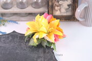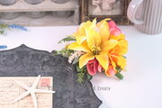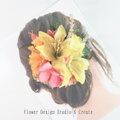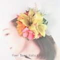 オレンジのハイビスカスと黄色い百合のヘアクリップ ハイビスカス オレンジ ピンク プルメリア フラダンス フラ リゾ婚