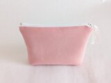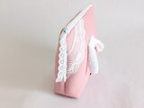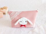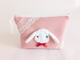 ピンクの生地に、繊細なレースとふわふわのうさぎのアップリケをしたポーチです。