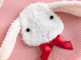 中央のうさぎはタオル地で作り、黒いビーズの目と赤いリボンで可愛らしく仕上げています。