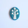 深いブルーグリーンのコットン地に小さなtreeを丁寧に手刺繍しました。素朴な北欧風のデザインです。周囲には極小のビーズをあしらっています。