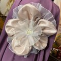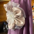 クリームイエローの帯ベルトがウエストをきゅっとマークし、背中には取り外し可能な大輪シャンパンフラワー作り帯を一輪。オーガンジーの透け感が、無地の上でふわっと咲き誇ります。