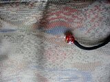 中綿を入れ、黒の着物で作ったループを付け、ループの先に、トンボ玉と真珠の玉を付けています。