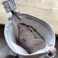 内側にはラベンダーカラーの濃淡プリントのスマホサイズのポケットがあります。