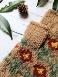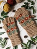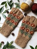 薄茶に赤の花模様を編み込んだ、手編みの指先フリー手袋です。