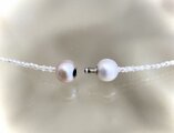 留め具はピンクと白の淡水真珠を加工したPPS。使いやすさとデザインで決まりです。留め具を前に持ってきて可愛いネックレスに変身です。PPS(プッシュアンドプルシステム)は装着時に押し込み、外す時に指先を食い込ませるだけの簡単着脱です。PPSの操作の仕方はYouTubeの動画を参照くださいね。URLは https://youtu.be/uRaFyFVrJP4