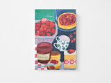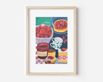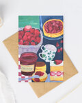イチゴの季節ののピクニックのイメージで、カゴいっぱいの苺やケーキ、ジャムを描いた水彩画のポストカード「3枚セット」です
