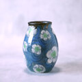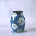 紺色の地に白化粧泥で花模様を描き散らした中サイズの花瓶です。