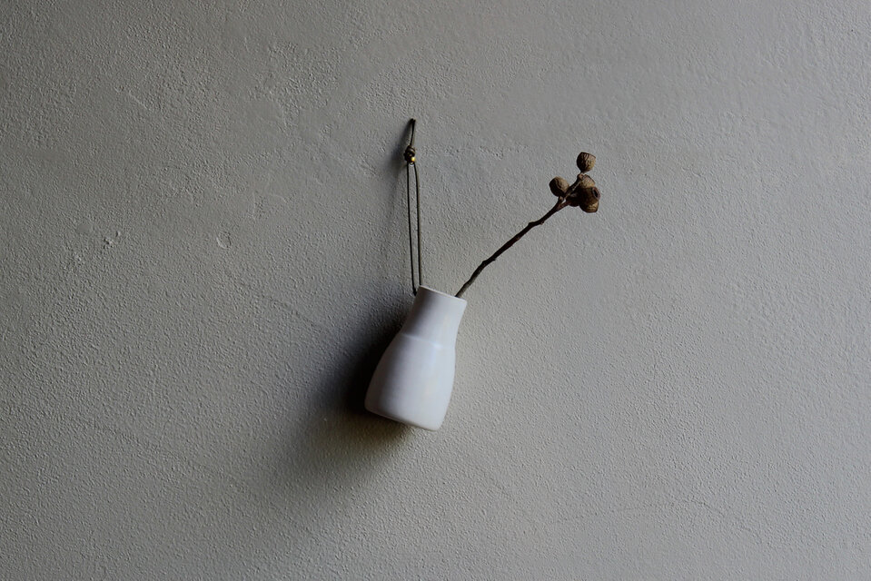 吊り下げて使うことのできる小さな一輪挿しです。