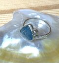 お花模様が彫り込まれたきれいなブルーのアクアマリン。三角形の形もユニークです。シルバー950のリングに手彫りでエングレービングしています。天然のダイヤモンドも添えました。