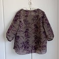 明るい色柄ですが銘仙の日本ならではの色合いは華やかさの中にも上品な感じがします 日本人の肌色にしっくりと馴染みます 前明きボタンなので閉じて1枚で着ても 中にTシャツを着て上から羽織って前明きで着ても素敵です メンズのMサイズですが 普通サイズの女性の方から大柄の方まで着こなせると思いました 秋色のブラウスも秋の花がプリントされていて 程よい透け感がお洒落でした これからの季節に嬉しい作品です