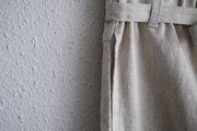 一般的なフルレングスに近い丈感となり、平織の綺麗なリネン生地とフルレングスのテーパードシルエット、サルエルと裁断パターンの要素も入って、シンプルに見えますがディティールが凝っていてバランスも取られている絶妙な仕上りです。