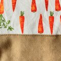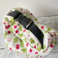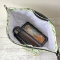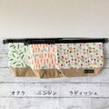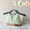 表地はシーチング生地においしそうなベジタブル柄がプリントされていて、底布はスエード調の生地で切替になっています。裏地には保温保冷シートを使用しています。