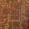 ココア〜シナモンブラウンの地に、タイル調の細密柄。縁をなぞる金線風のラインの中で、レンガ色・若草色の小花が密やかに踊ります。小紋の味わいをそのまま、軽やかに纏えるワンピースへ。