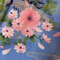 澄んだ青藤ブルーの地に、桜色の花々と庭園風景、ゆるやかな流水文。