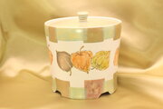 少し小振りの水指となります。夏と秋をイメージする色彩となっております。ほおずきに銀彩を用いており、蓋は薄緑色の灰釉を使用しております。