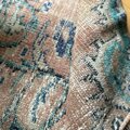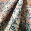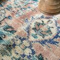 このラグの魅力は、甘さと爽やかさのバランス。くすんだピンクベージュの優しいベースカラーに、ターコイズブルーがキリッと映えて、大人っぽくも柔らかな雰囲気に仕上がっています。擦れや色むらも、ヴィンテージだからこそ生まれる“味”として楽しめるポイント。