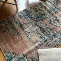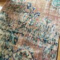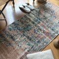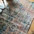 やわらかなくすみピンクベージュに、ターコイズブルーの花模様がふわっと重なる、なんとも雰囲気のあるトルコヴィンテージラグ。長年使い込まれた擦れ感が、まるでお気に入りのデニムのようにこなれた表情を見せてくれます。
