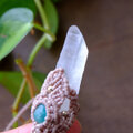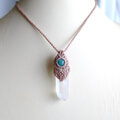 表面はうっすらすりガラスのようなマットな感じが神秘的なブラジル産レムリアンシード水晶ポイントと、上部には濃い緑色が特徴のロシア産アマゾナイトをあわせ、印象的で個性あふれるマクラメ編みペンダントに仕上げました。