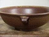 素地の外側に3本線を施し両耳を付けてから伊羅保釉を掛けて焼成しています。