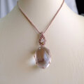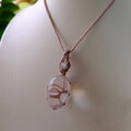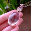 やや大きめサイズで透明感の高いブラジル産タンブル水晶と上部には小粒ながらも目を惹く愛と癒しの石と云われる良質なクンツァイトを合わせたマクラメ編みペンダントネックレスです。