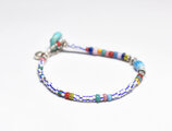 ターコイズブルーやブルーのシェブロンビーズ、シマシマ模様のカンネビーズ、レアカラーのホワイトハーツ、金赤色のホワイトハーツ、渋いピンク色のピンクマサイなどを繋いでいます。