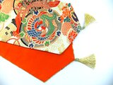 裏側は帯の中無地(正絹)を使用し金色のタッセル飾りを付けました。4点製作し長さ、オランダ線のあるものや裏地の色がそれぞれ違います。特にご指定なければランダムに発送します。