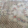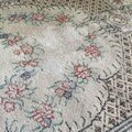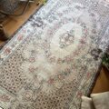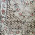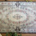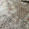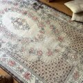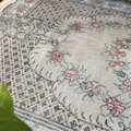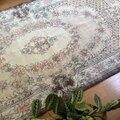淡い生成りのベースに、ローズピンクの花々がリズムよく咲き誇る、エレガントなトルコヴィンテージラグ。中央のメダリオンが柔らかに浮かび上がり、周囲を繊細な模様が縁取ることで、まるで古い洋館のサロンに敷かれていたような気品を漂わせます。