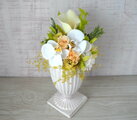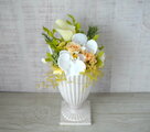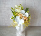 アンティーク調の上品な器に上質なアーティフィシャルフラワーのカラーと胡蝶蘭のをメインにプリザーブドフラワーのバラ、アジサイなどを使用したアレンジメント。