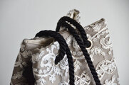 ベージュの生地にブラックチュールを重ねたヌーディーカラー。さらに繊細で華やかな刺繍がほどこされ、キラリと輝くシックでモードなポシェットマリンバッグです。
