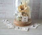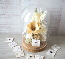ガラスドームの中にナチュラルなホワイト系でのお花でまとめた誕生石のフラワードーム。