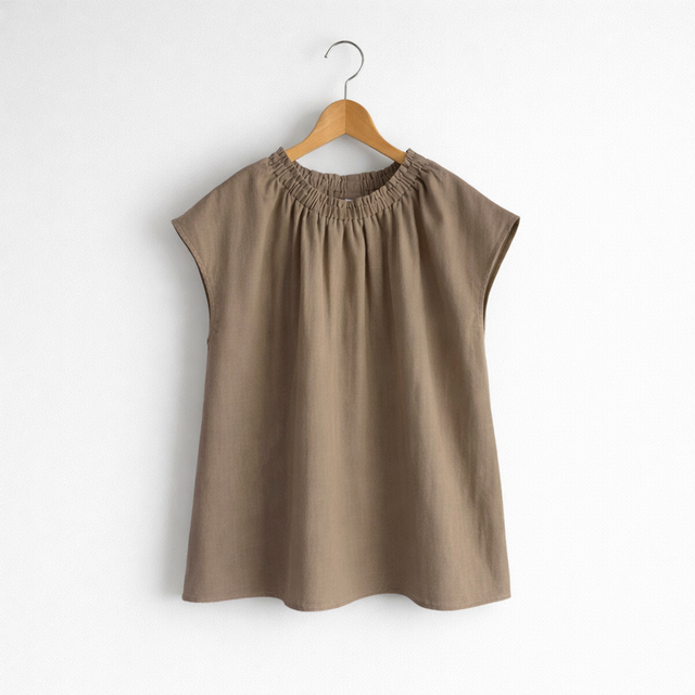 ギャザークルーネック フレンチ袖プルオーバー ブラウス|オーガニック綿100%ダブルガーゼ_Mocha