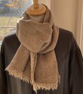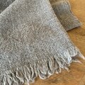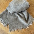 無染色のグレー、メリノ種の羊毛を手で紡ぎ、織り上げたマフラーです。