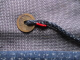 中綿を入れ、男絣で作ったループを付け、ループの先に古銭の寛永通宝と山サンゴを付けています。