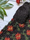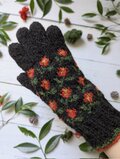 闇のような黒地に赤の花が群れて咲く、手編みの編み込み模様5本指手袋です。
