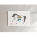 はがきサイズの紙にシルクスクリーンの手刷り、墨や顔彩で彩色しました。