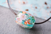 泡を入れた水色の地に、コスモスを咲かせ金魚を泳がせました。