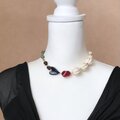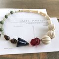 いろいろな素材の個性的なビーズをあわせて カラフルで楽しい首飾りにしました。