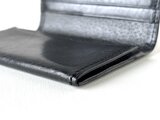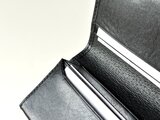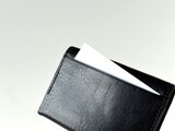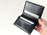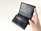 CRAFT39製品の名刺ケースはの「風琴マチ」という日本伝統技法を用いた特殊構造になっています。通常は内折りにマチを作るところ、外折りの"風琴マチ"構造にする事で、名刺を出し入れする際の引っ掛かりをなくし、最大20枚入れても厚さを抑える構造を実現しました。かぶせ側には、受け取った名刺を収納出来るポケットを二箇所搭載。閉じた際の背面にはフリーポケットを搭載させ、より収納力の高い構造にしました。内装には軽量化を目的とした、ほつれ留め加工が施されたコットン100%の天然素材を採用。加えて、内革にはアメ豚をあしらい、擦り傷や汚れが目立ちにくい構造にしました。ピンっと伸びる、折り紙のような美しい直線で構成されたデザインも注目ポイント。奥行きのある黒い光沢とさりげない内革のきめ細かいシボが、大人な魅力を引き出してくれます。名刺入れの正面と背面で異なる豊かな革の表情をお楽しみ頂きながら、巧みな職人技を感じて頂けると幸いです。