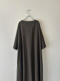 胸元から上はカーキブラウン、下半身はブラックで切り替えられ、シンプルながらモード感のあるデザインです。ゆったりとしたシルエットで、リラックスした着心地ながら体型をさりげなくカバー。七分袖のドルマンスリーブが抜け感を演出し、ナチュラルな大人のスタイルを叶えます。
