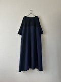 胸元から上はブラック、下半身はネイビーで切り替えられ、シンプルながらモード感のあるデザインです。ゆったりとしたシルエットで、リラックスした着心地ながら体型をさりげなくカバー。七分袖のドルマンスリーブが抜け感を演出し、ナチュラルな大人のスタイルを叶えます。