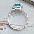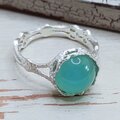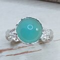 銀のレースを纏った涼しげなシーブルーカルセドニーのシルバーリング*レース素材そのもののテクスチャーも綺麗でナチュラルな印象とアンティーク感があります*グリーンを帯びた水色の丸くて可愛いシーブルーカルセドニーをお楽しみ下さい*リングはマット仕上げ、10~18号(推奨サイズ)の範囲を目安に調整可能、サイズ確定後にレースで包むように石留め致します*