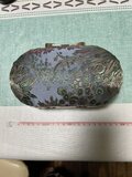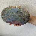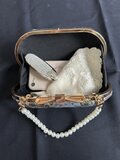 パーティバッグはそのままでクラッチバッグ。パールのショートハンドルとチェーンと合皮編み込みショルダーストラップの二本付きで、スリーウェイでご使用いただけます。