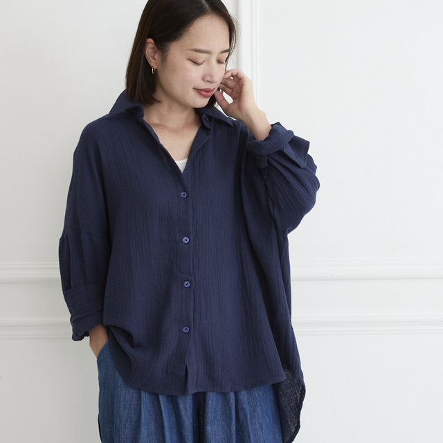 柔らかサラサラ素材✨ 羽織る コットンダブルガーゼ シャツ ネイビー 0699NV