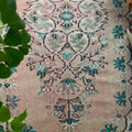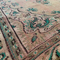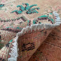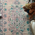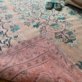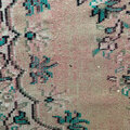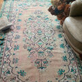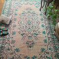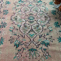元は朱赤にグリーンのオーバーダイを施し、ドラマチックなペールピンクとエメラルドグリーンが合わさった、絶妙で個性的なお色も魅力的なトルコ ヴィンテージラグ
