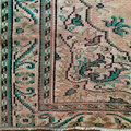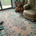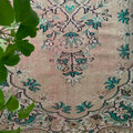 ボタニカルと幾何学文様が相まって、ラグ一枚が絵画の様に優美、手織りとアンティークの美しさを感じます